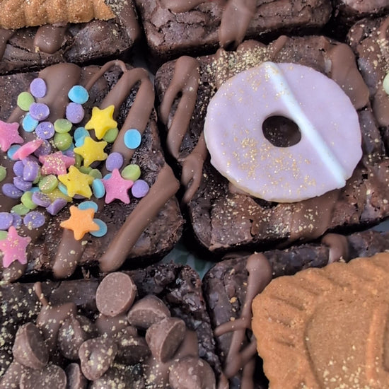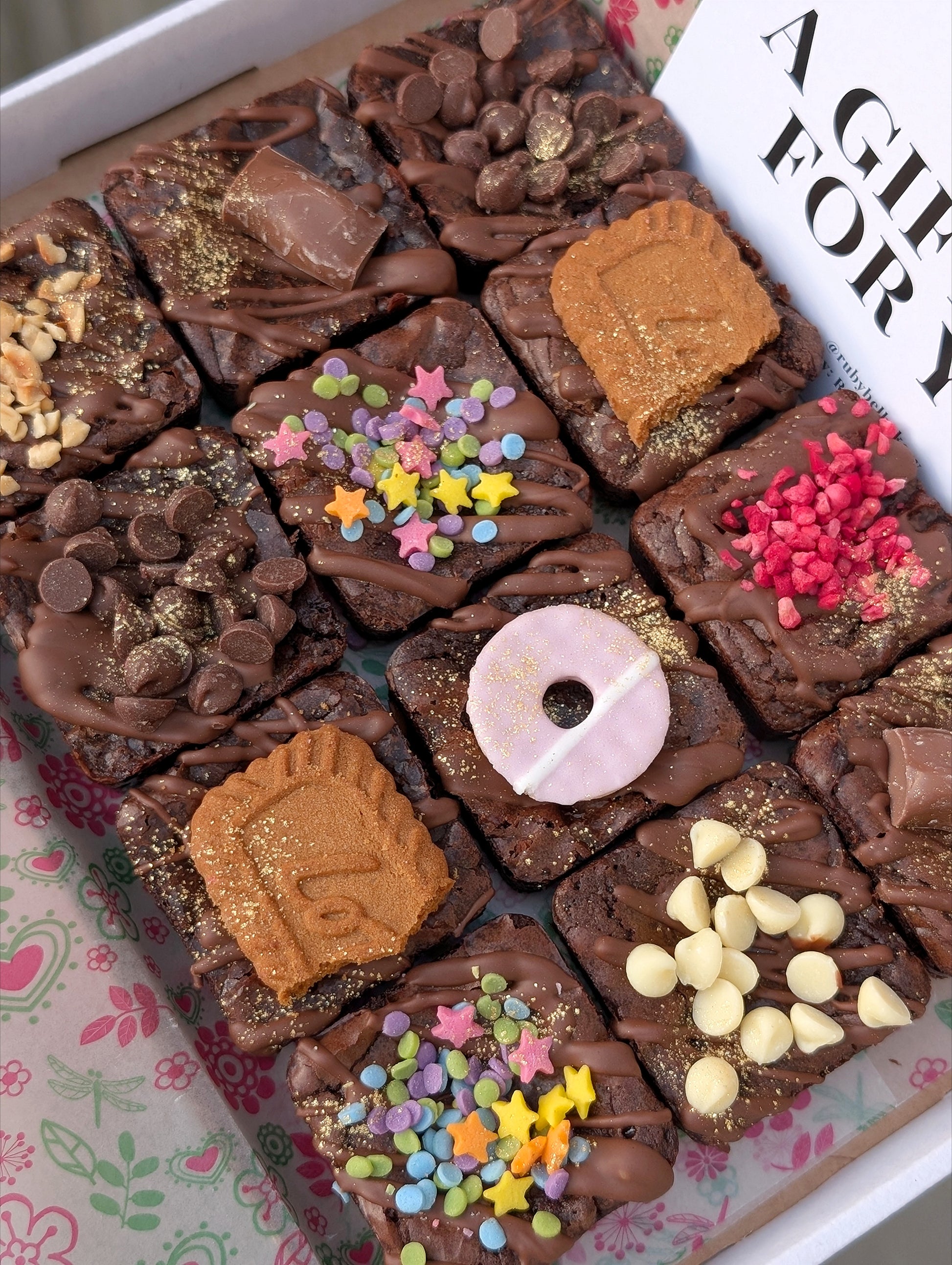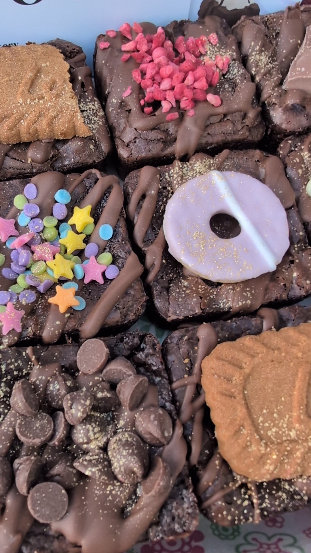 Each brownie is carefully baked and once cooled, topped with a drizzle of milk chocolate, topping, and dusted with edible glitter.