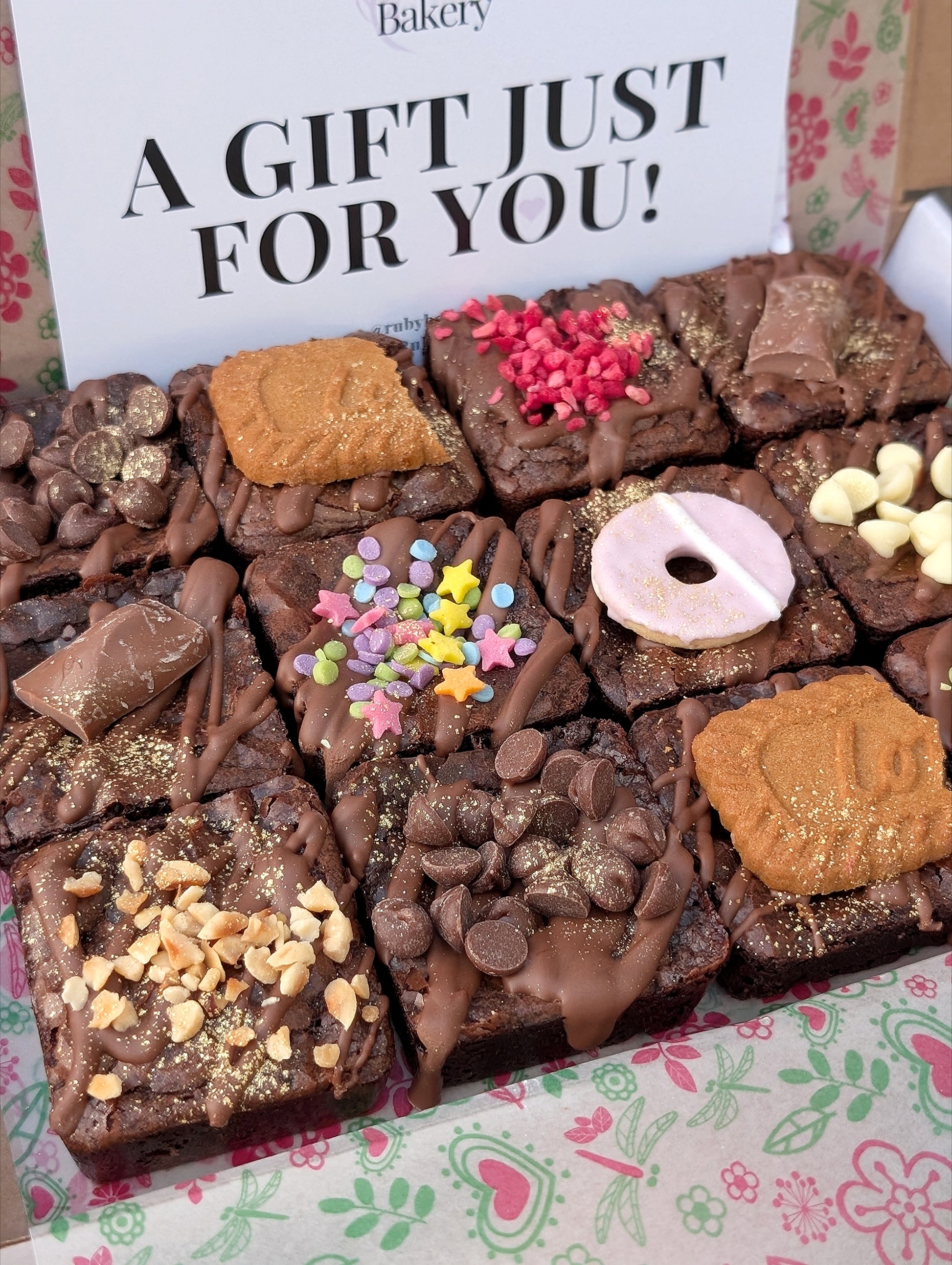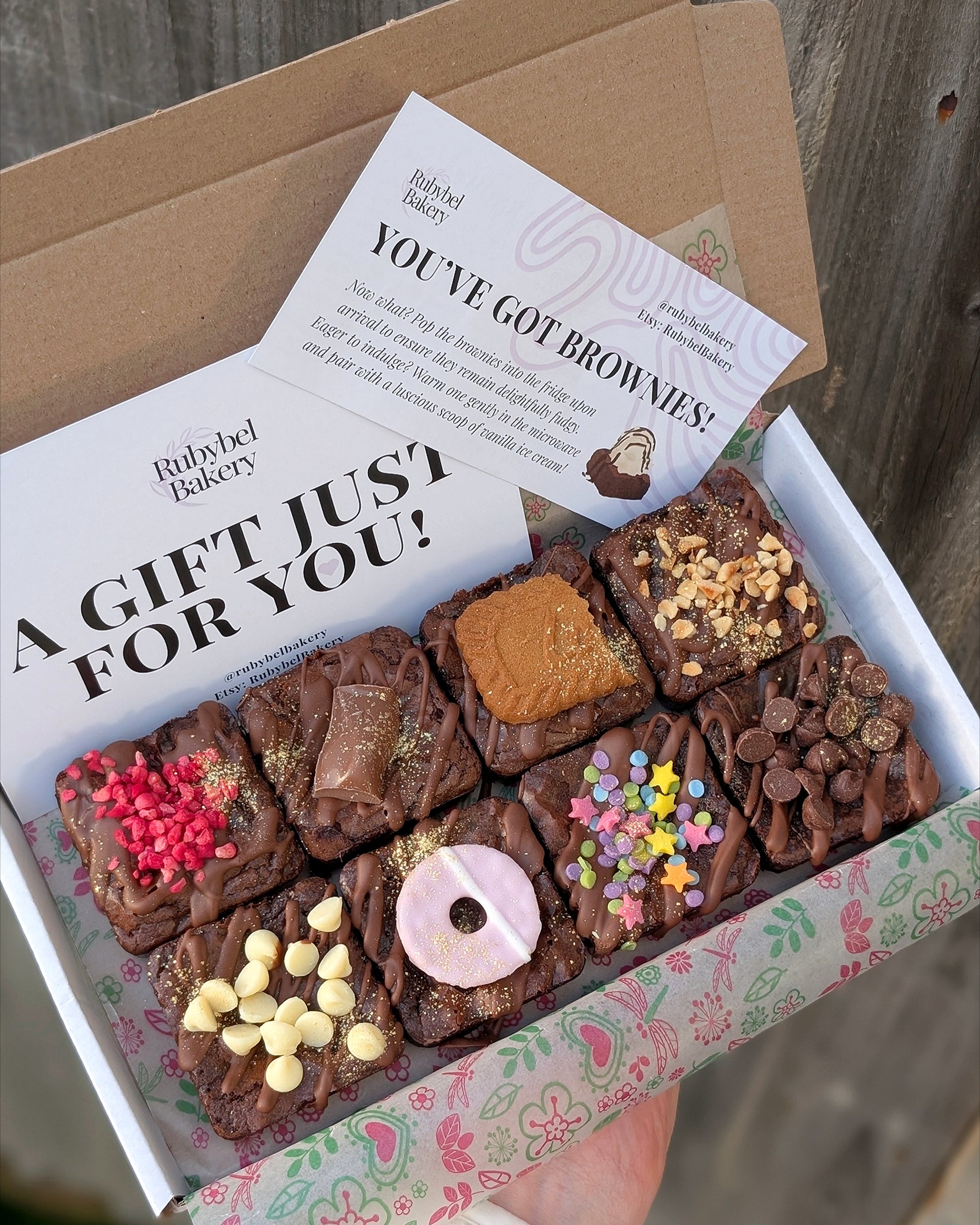 As they are letterbox bakes, each brownie bite is approx 5cm square and 2cm high (inc. topping). They are all baked to order so there will be some variation to design and finish.